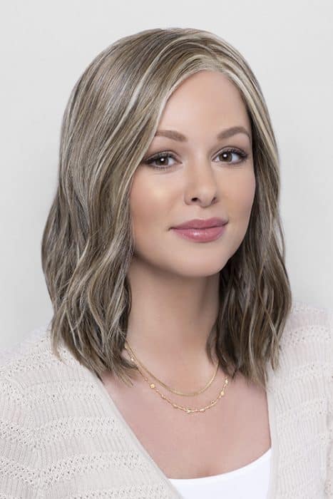 Highlighted blend of ash and platinum blondes and chocolate roots.